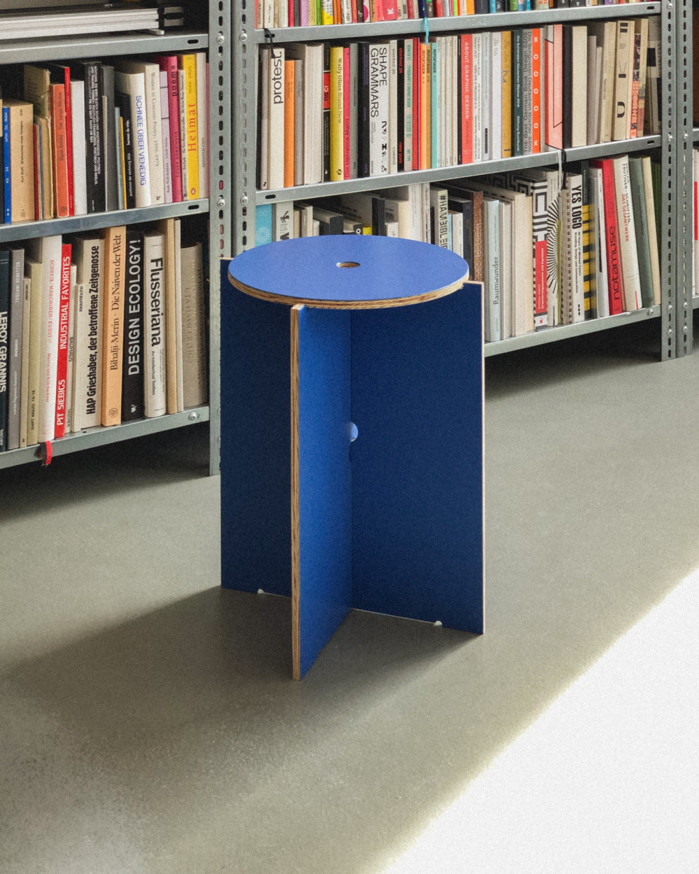 Ein Hocker für SUEDHANG Kaffee in 3 Teilen zum mitnehmen und zusammenstecken. Produziert von in Freiburg aus europäischer Kiefer. Im Bild ein Prototyp in Blau.