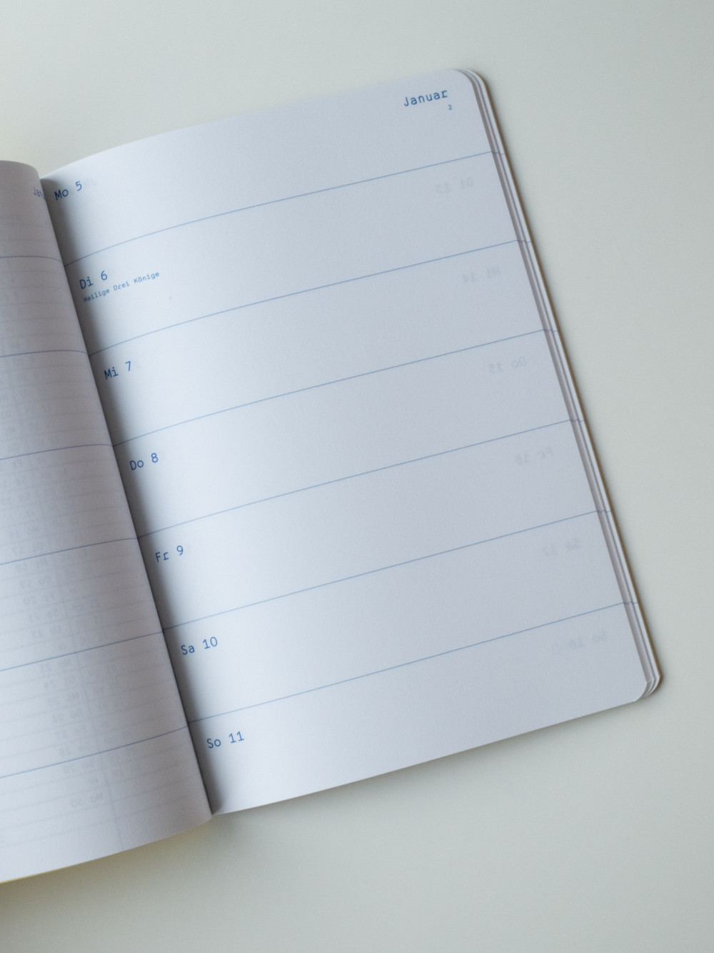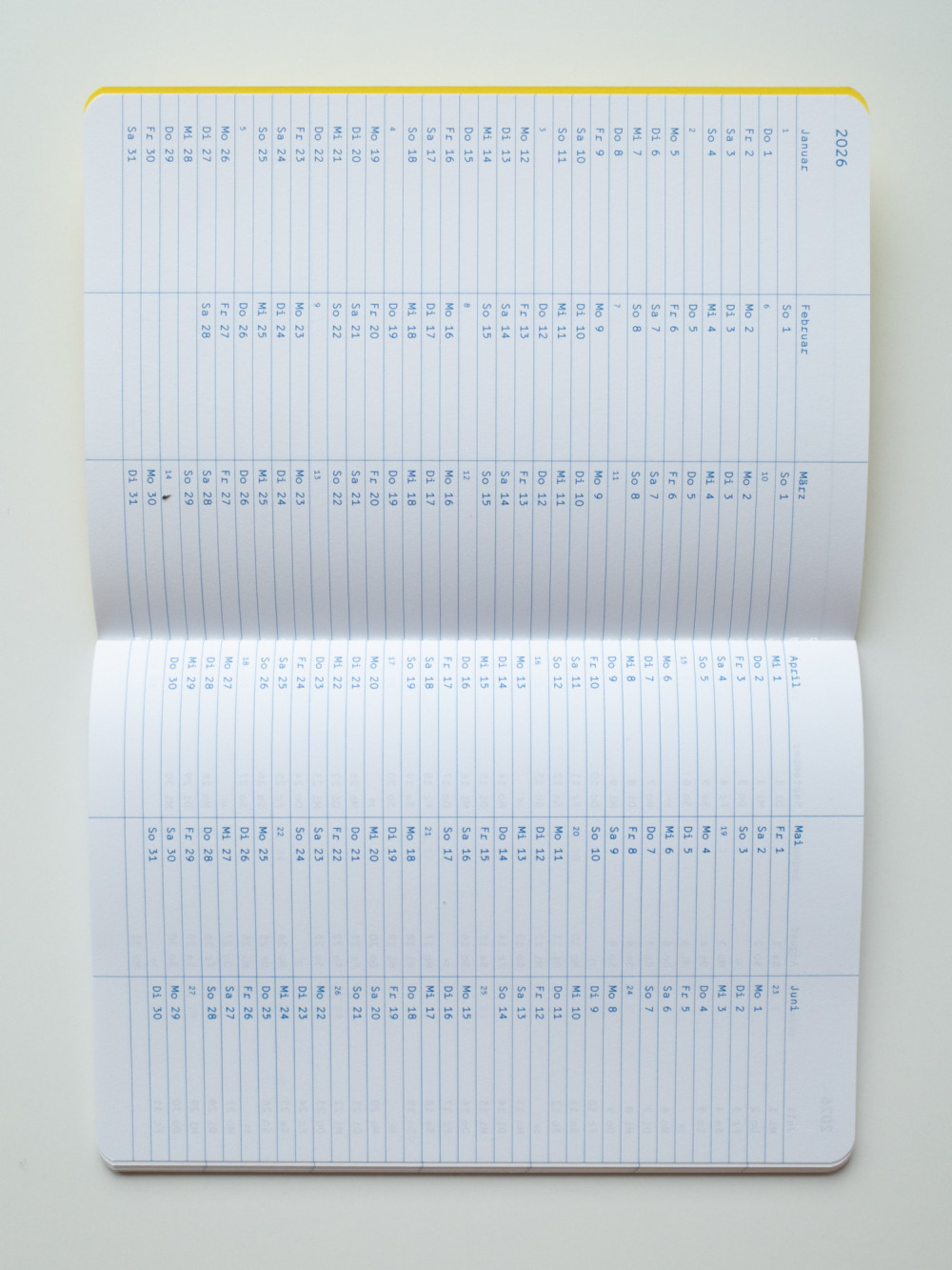 Aus unserem ungebundenen Kalender werden zwei leichte Hefte mit Steppstich-Fadenbindung in A5! Ein Kalender mit gewohnt großzügigen Wochenseiten und zwei Jahresübersichten – ohne Ratschläge und Wohlfühltipps. Und ein Notizheft ohne Linien, das viel Platz lässt. Damit du ohne Eselsohren durchs Jahr kommst sind die Ecken abgerundet.