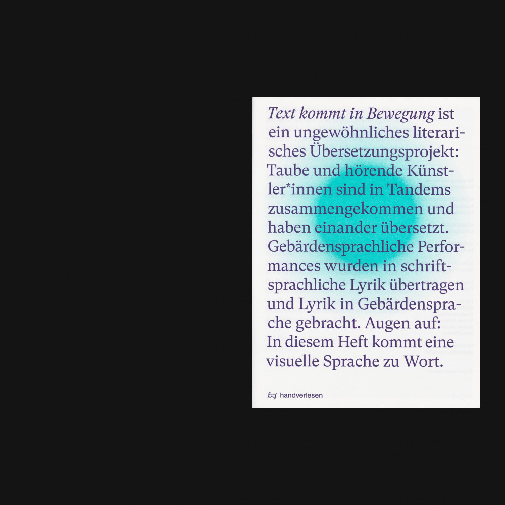 Text kommt in Bewegung ist ein ungewöhnliches literarisches Übersetzungsprojekt: Taube und hörende Künstler*innen sind in Tandems zusammengekommen und haben einander übersetzt. Gebärdensprachliche Performances wurden in schriftsprachliche Lyrik übertragen und Lyrik in Gebärdensprache gebracht.
