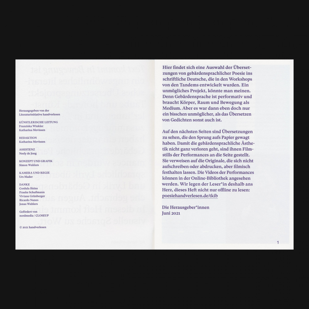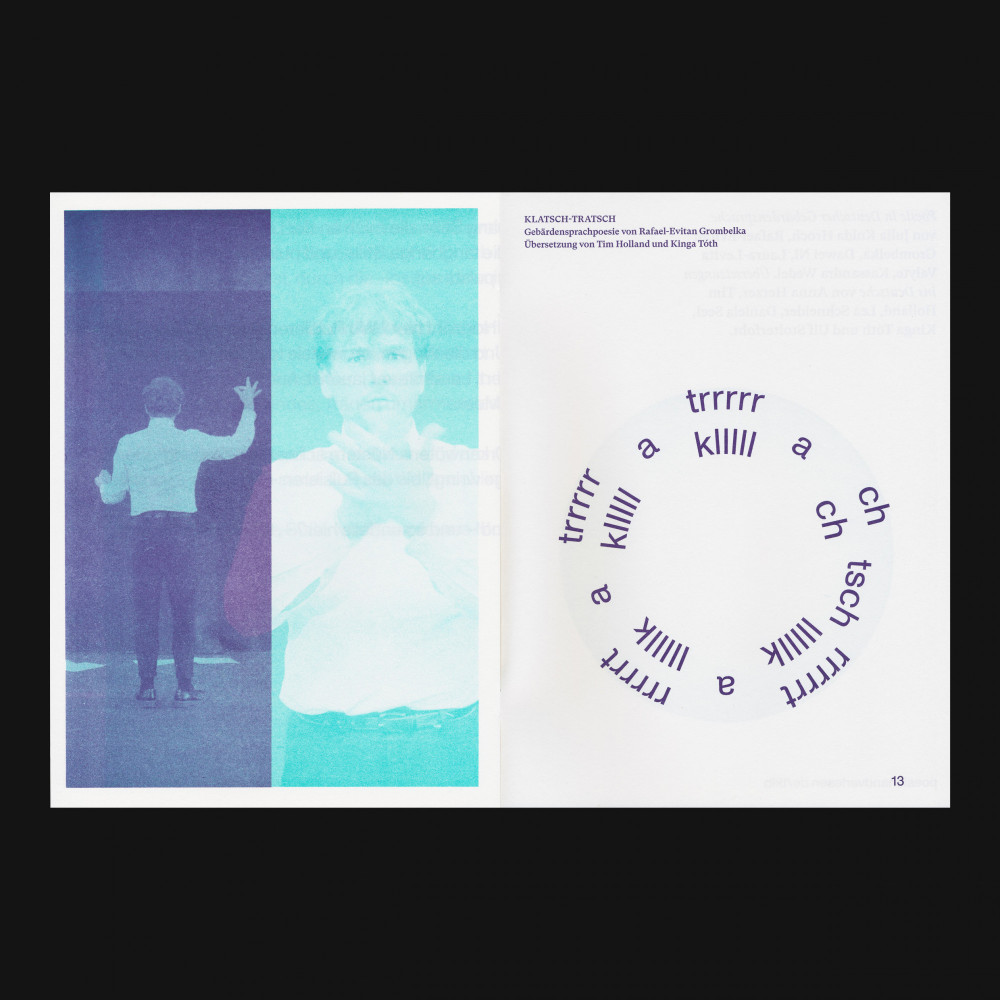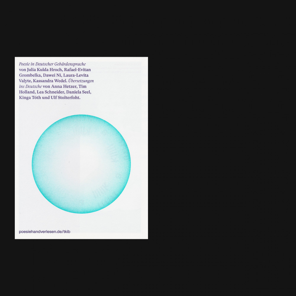 Poesie in Deutscher Gebärdensprache von Julia Kulda Hroch, Rafael-Evitan Grombelka, Dawei Ni, Laura-Levita Valyte, Kassandra Wedel. Übersetzungen ins Deutsche von Anna Hetzer, Tim Holland, Lea Schneider, Daniela Seel, Kinga Tóth und Ulf Stolterfoht.